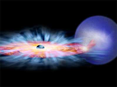 صورة تخيلية للثقب الأسود الذي هو عبارة عن نجم ضخم جداً انفجر على نفسه وانضغطت مادته بقوة هائلة مما شكل ما يسمى بالثقب الأسود وهذا المخلوق قادر على ابتلاع أي جسم يقترب منه حتى لو كان بحجم الأرض!!
