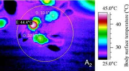 صورة بالأشعة تحت الحمراء، ونرى في الدائرة الحمراء في الوسط عند الدرجة 44.4 ، إن هذه الصورة تظهر فقط الطيف الحراري للنحل، فالمناطق الزرقاء يوجد فيها نحل ولكن درجة حرارته بحدود 33 درجة، أي لا يمارس الهجوم على الدبور، أما المناطق ذات اللون الزهري فهي طيف حراري لنحلات تتجمع حول الدبور وترفرف بجناحيها وبالتالي ترتفع درجة حرارة سطح جسمها أكثر من 40 درجة مئوية.