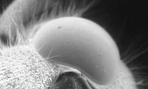 صورة دقيقة تظهر عين النملة، وللنملة عيون مركبة تستطيع بواسطتها أن ترى الأشياء ولكن رؤية ضعيفة بسبب أنها تمضي معظم وقتها في الظلام تحت التراب. وتأمل معي كيف أن هذه العين محاطة ببعض الشعيرات الدقيقة لحمايتها!