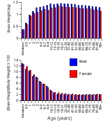 يبين هذا المخطط تغير وزن الدماغ مع تقدم العمر، الشكل الأعلى يوضح تغير وزن الدماغ مع تقدم العمر منذ الولادة وحتى عمر 86 سنة، والشكل السفلي يبين النسبة المئوية لوزن الدماغ بالنسبة لوزن الجسم وكيف تتغير مع تقدم العمر. ويتبين لنا أن دماغ الرجل أكبر من دماغ المرأة. ويتبين كذلك أن نسبة وزن دماغ المرأة إلى وزن جسدها تكون هذه النسبة أكبر عند النساء بقليل من الرجال.